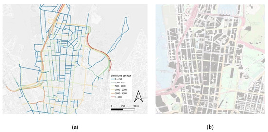 (a) Spatial distribution of light vehicle volumes across the Sydney CBD during the morning peak. (b) Building polygons, as barriers to the noise propagation, in the Sydney CBD from OpenStreetMap.