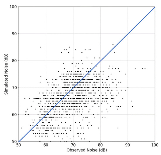 For the selection of the most appropriate model parameters set, three criteria were used including the computational time, the root mean square error (RMSE), and the mean absolute error (MAE). Results suggested that parameter set 2 provides the most reasonable compromise between the computational time and the model accuracy, which was thus chosen to estimate traffic noise for the Sydney CBD as a case study. A comparison between the observed and the simulated noise for parameter set 2 is provided in Figure 7.