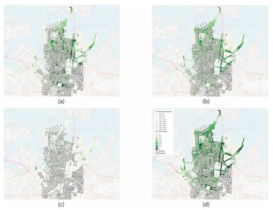 The result presented in Figure 3a cannot be used directly for visualization purposes because the network is currently represented in a discrete format by a finite number of sampled locations. To obtain a continuous representation of urban greenery along the streets, we performed an interpolation from the GVI values of the existing sampled locations. The interpolation results are shown in Figure 3b. We can see that the GVI values are now continuous across the entire network, forming a so-called raster image. The remaining task to be conducted was to mask the raster considering only roadsides where urban greenery was expected. To do so, we considered a polygon of the road network and a buffer area surrounding the streets with a width of 10 m (see Figure 3c). The final result after masking is illustrated in Figure 3d. It shows how urban greenery is spatially distributed along the streets in the network.
