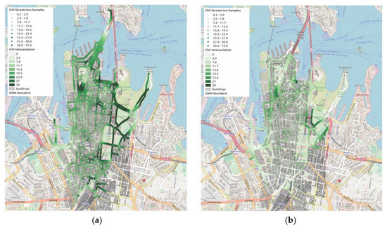 A comparison of urban greenery between (a) summer and (b) winter. The legend represents the GVI value ranges.