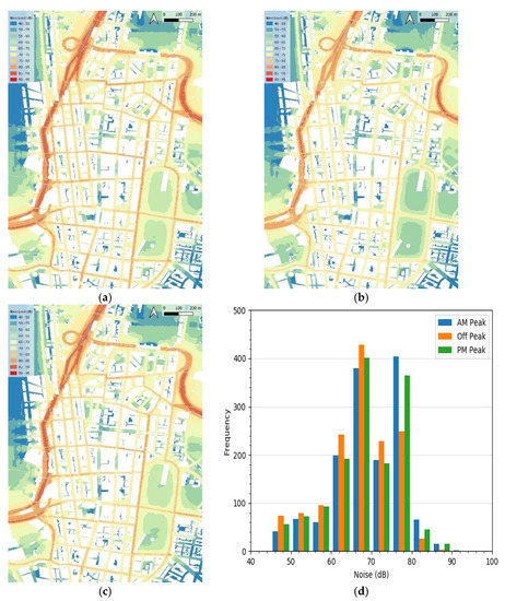 Spatial distribution of estimated traffic noise in the Sydney CBD for (a) the morning peak, (b) the off-peak period, and (c) the afternoon peak; and (d) distributions of the estimated noise levels for different times of day.