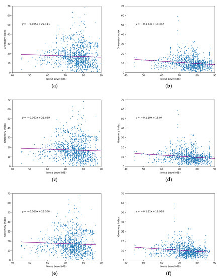 Correlation between estimated traffic noise levels and urban greenery index across the Sydney CBD in summer (a,c,e) and winter (b,d,f). Analysis is performed for the AM peak period (a,b), PM peak period (c,d), and off-peak period (e,f).