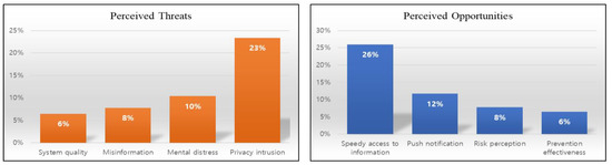 Following the procedure of qualitative data coding proposed by Braun and Clarke [30], we first generated initial codes from the responses. Next, we collated the initial codes into a broader level of themes. The coding results showed that individuals’ appraisals of the use of contact tracing apps were mixed and often contradictory. People evaluated the use of contact tracing apps as either beneficial or detrimental, while some evaluated them as beneficial and detrimental simultaneously due to different aspects of the technology. Although people appraised the use of contact tracing apps as beneficial due to the expected positive consequences (e.g., speedy access to information, push notifications, public risk perception, prevention effectiveness), they also appraised them as detrimental due to the expected negative consequences (e.g., system quality, misinformation, privacy intrusion, mental distress). Speedy access to information was found to be most salient among the perceived opportunities, whereas privacy intrusion was found to be most salient among the perceived threats (see Figure 2).