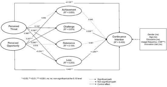Figure 5 shows the results of the structural model test. The model accounted for 43% of the variance in continuance intention. The results indicated that perceived threat negatively influenced continuance intention (β = −0.129, p < 0.001), while perceived opportunity positively influenced continuance intention (β = 0.493, p < 0.001). In addition, the results showed that perceived threat significantly increased challenge (β = 0.133, p < 0.05), deterrence (β = 0.336, p < 0.001), and loss emotions (β = 0.366, p < 0.001). In contrast, perceived opportunity significantly increased achievement (β = 0.257, p < 0.001) and challenge emotions (β = 0.298, p < 0.001) and decreased loss emotions (β = −0.234, p < 0.001). The results also revealed that only two classes of emotions—challenge and loss—were significant factors that influenced continuance intention. Challenge increased continuance intention (β = 0.228, p < 0.001), whereas loss decreased continuance intention (β = −0.264, p < 0.001).
