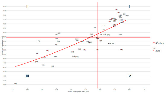 The coefficient of determination (R2) 64% in 2018 indicates rather strong positive relationships between the objective conditions and opportunities for human development and subjective well-being and happiness, which allows choosing any of these indicators for further investigation of the relationships between digitalization and quality of life (Figure 1). Nevertheless, several countries lie far from the common correlation line.