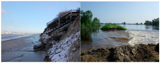 Stairs destroyed by the sea (left, Author: B. Ksit). A flood embankment broken during the passage of a peak wave (right, Author: I. Laks).