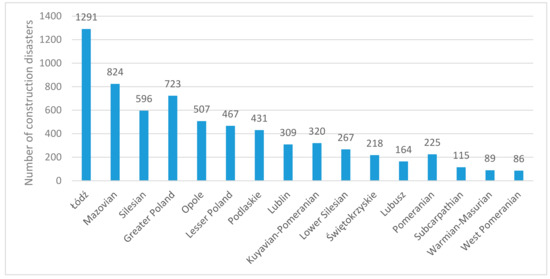 Number of construction disasters in Poland in 2004–2019 by voivodeship [47].