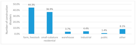 By analyzing the data obtained from [47], it can be concluded that the constructions most frequently subject to disasters were low, small-cubature residential, farm, and livestock buildings of masonry construction. They constituted 83.8% of all construction disasters that occurred in Poland between 1995 and 2019. Figure 7 shows the types of buildings that were destroyed in 2004–2019.