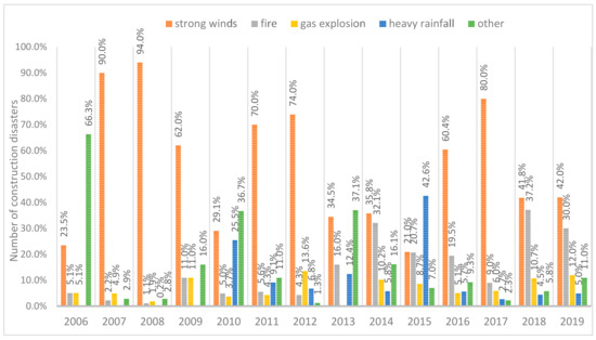- strong winds are the cause of the greatest number of construction disasters (more than 50%). In turn, fires can be listed as the second factor causing construction disasters. Other events such as a gas explosion or rainfall occur in similar numbers (Figure 10),