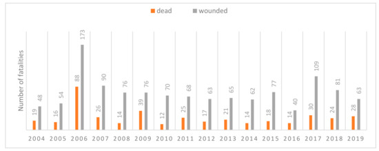 The General Office of Building Control, acting in accordance with [33], maintains a register of construction disasters. In Poland, between 1995 and 2019, i.e., within 25 years, there were 8169 construction disasters [47]. Figure 5 shows the number of construction disasters between 1995–2019. Most of them happened in 2008, with as many as 1113.