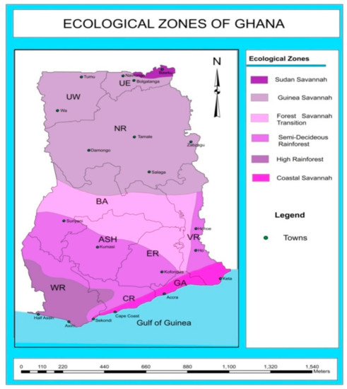 Ghana’s ecological zones [11]. Note: UE_Upper East region; UW_Upper West region; NR_Northern region; BA_ Brong Ahafo region; ASH_Ashanti region; ER_Eastern region; VR_Volta region; GA_Greater Accra region; Central region; WR_Western region