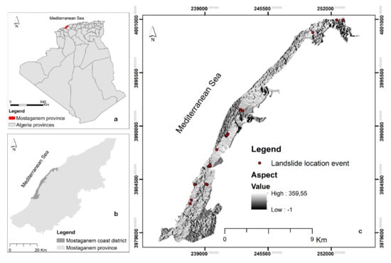 Geographical location of the study area: (a) geographical position of Mostaganem province in Algeria; (b) position of the coast district in the Mostaganem province; (c) Mostaganem coast district location.