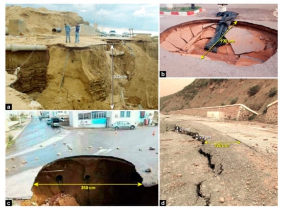 The landslide inventory map is a key step for landslide susceptibility prediction [54,55]. This map can be used to prevent events that could occur in unstable areas and compare them with the modelled landslide susceptibility map [2,21,56,57,58]. The landslide inventory map could be produced on local, regional or national scales; its conception basically depends on the scope of the study [19,46,59,60]. In our study area, we identified 17 cases of landslide events during the period between 2016 and 2019 (Figure 1). The compilation of the landslide inventory map was accomplished through a range of interviews with administrative personals such as the National Coastal Commission (Commissariat National du Littoral) and the Directorate of Public Works of Mostaganem province. Interviews with the local residents of Mostaganem were also performed. The use of Google Earth, local newspapers, and some reports published by the Laboratory of Maritime Studies (LEM/Algiers) was also necessary to complete our database. Furthermore, intensive field surveys were performed for three years (2017–2019) in order to validate the collected data and identify the locations. Based on interviews, reports analysis and field surveys, different geological hazard events that occurred recently were identified (Figure 3). The recorded cases are mainly shallow; they occurred in soils at depths ranging from a few decimeters to a few meters. These events took place close to the urban area, near the network of roads that has been constructed on the consolidated dune system, a feature with high susceptibility to coastal hazards.