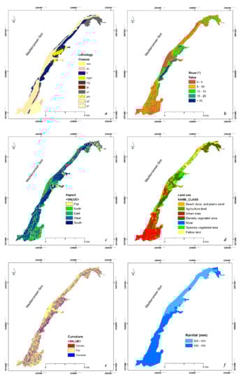 Lithology is an important parameter in landside occurrence and susceptibility mapping [37,43,61,62]. The digitizing of the geological map of Bosquet-Mostaganem (scale: 1/200,000) allowed for the identification of 10 lithological units in the study area (Figure 4a). The main registered rocks belong to Quaternary, Pliocene, and Miocene.