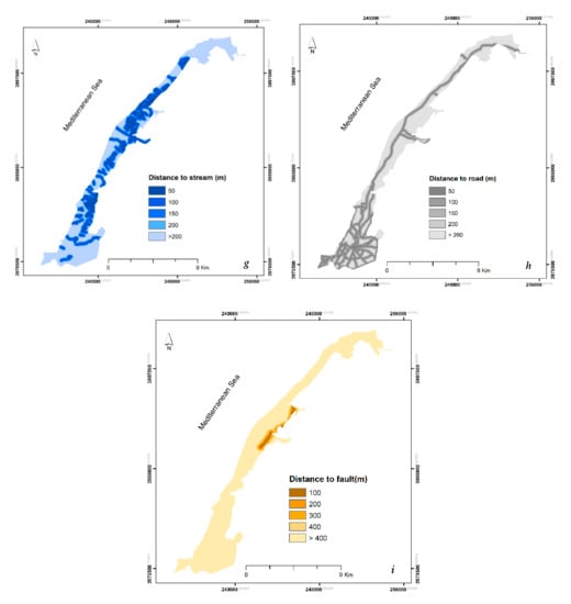 The province of Mostaganem has a significant land aquifer [79,80]. This resource could indicate the high density of streams in the region. The distance to stream plays a crucial role in landslide phenomena. It could affect slope stability where the streams saturate the lower part of the soil, increasing its water level [17,81]. Methodologically, the streams were digitized from a topographic map (1/25,000). Furthermore, a multi-stream buffer was created using GIS software tools and divided into 5 classes with a 50 m interval (Figure 4g).