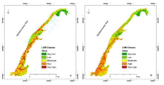 The LSM maps were grouped into 5 classes: very low, low, moderate, high and very high (Figure 5). The very low areas susceptible to landslides cover 3.823 km2 (Figure 5a); they are mainly located in densely vegetated areas. Plant roots provide high stability to the soil, and consequently no landslide event has been recorded in this class (Figure 6a). The zone with low susceptibility to landslides covers 11.484 km2. These areas belong to the beach, dune, and sand class corresponding to a very low slope (0–5°). The moderate class covers an extended area of 16.329 km2. The high and very high sites were located near the urban nucleus and close to the national road (RN11), and they cover a sector of 13.249 km2 and 6.834 km2, respectively. A very high landslide density is observed near these anthropogenic features (Figure 6). The high and very high classes were located mainly in the Western part; they were estimated as 72.24% (9.604 km2) and 79.19% (5.142 km2). The Eastern part records a high susceptible area of 3.689 km2 (27.75%). The very high class covers an area of 1.422 km2 (20.80%), and these dangerous sites are mostly situated in the fallow land class.