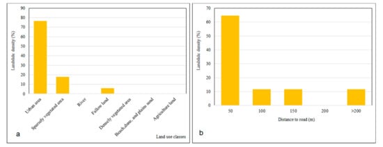 Landslide density: (a) Land Use (LU) map and (b) distance to road.