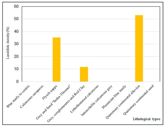 Zones with a very low susceptibility to landslides were registered in areas with dense vegetation. Vegetation plays an important role in enhancing slope stability and reducing landslide susceptibility [97]. Zones with the lowest landslide susceptibility are located along beaches, mobile dunes, and sand plains (Figure 5). Generally, these zones are flat and do not register any event in this land cover class. The regions with moderate landslide susceptibility were identified close to built-up areas and in fallow land. Due to the predominance of streams, the zones with high and very high susceptibility were recorded in the urban nucleus and close to the national road (RN11). In the coastal district of Mostaganem, most human settlements were constructed in the quaternary continental alluvium and sand classes. Both lithological types have weak shear strength when hydrogeological conditions are favourable, leading to an increase in landslide susceptibility. In this respect, the quaternary continental alluvium recorded high landslide event density, which has been estimated at about 52.94% (Figure 7). The results obtained show clearly that the density of landslide events increases with the susceptibility degree (Table 5). The current situation in Mostaganem is due to unplanned and uncontrolled use of this area. Since 2000, the landscape of the Mostaganem coast district has undergone an important alteration due to the excessive exploitation of natural resources and uncontrolled expansion of residential buildings, regardless of environmental impacts (slope cutting, floods) and in spite of the Littoral Law, which should protect the coastal zone [98]. The situation in the Mostaganem coast district reflects a major lack of planning during the urbanization process [45,99].