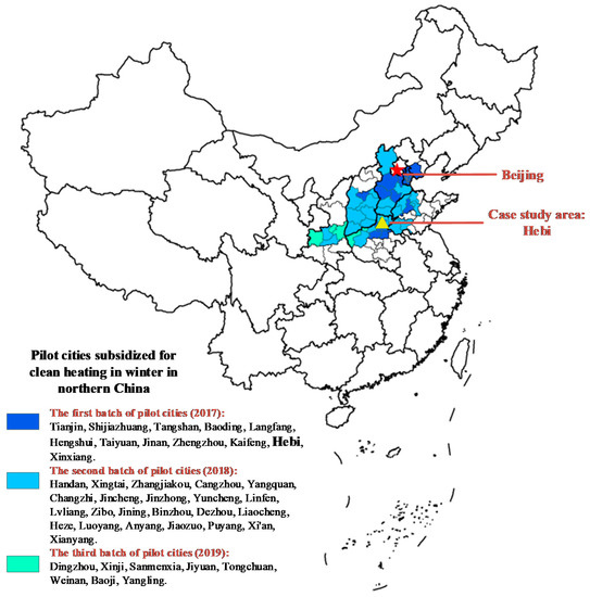 In 2017, 12 cities in northern China were selected as pilot cities that would be subsidized for cleaner heating in winter. In 2018 and 2019, 23 cities and 8 cities were added to the list, respectively (Figure 1). Central and local governments subsidized these cities to promote cleaner heating [31]. After a period of promotion, the effects of cleaner heating policies can to be investigated. This study selects Hebi area as a case study area, which belongs to the first group of pilot cities, to identify rural households’ WTP for cleaner heating and its key factors.