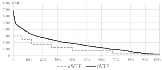 According to the survey data, approximately 76% of households had bought at least one facility for cleaner heating before the survey. On the other hand, about three quarters of households showed a willingness to buy facilities for cleaner heating in the next 12 months. All of the households were willing to pay for cleaner energy. The tWTP, with its components, of each household was estimated. The distribution of households’ tWTP and eWTP are shown in Figure 2. With a wide distribution, the households’ tWTP is from RMB 250 to RMB 6800, with an average of RMB 1778 and median of RMB 1550. Only 1.4% of households’ tWTP exceeds RMB 5000, while 80% of households’ tWTP is below RMB 2750. The eWTP account for 59% of the tWTP by average. eWTP has a lower limit of RMB 250 and upper limit of RMB 3000 for a heating period. Compared with the annual energy expenditure for household heating in the USA (USD 720) [34], the average eWTP in the rural areas of Hebi is RMB 1049 (USD 157), which is roughly 22% of the average in the USA. In summary, the WTP for cleaner heating is relatively low in most rural families, and there is huge disparity in household WTP for cleaner heating. The reasons for this difference should be investigated, and based on this, a diversified incentive system and multiple subsidy standards should be established.