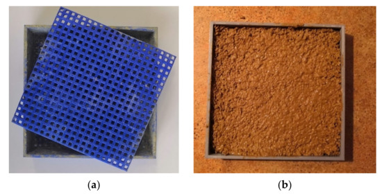 A square sample box was designed and 3D-printed using polylactic acid (see Figure 1a). The bottom of the container was perforated with square holes of 2 × 2 mm in a square lattice of 3.5 mm. The function of the holes is to ensure the diffuseness of water drying.