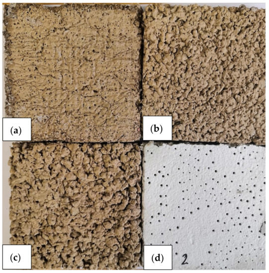 Prepared samples and the referent sample: (a) 1–2.5 mm grain size, 50% paper sludge (PS); (b) 2.5–5 mm grain size, 70% PS; (c) 5–10 mm grain size, 70% PS; (d) commercially made mineral fibre panel.