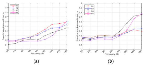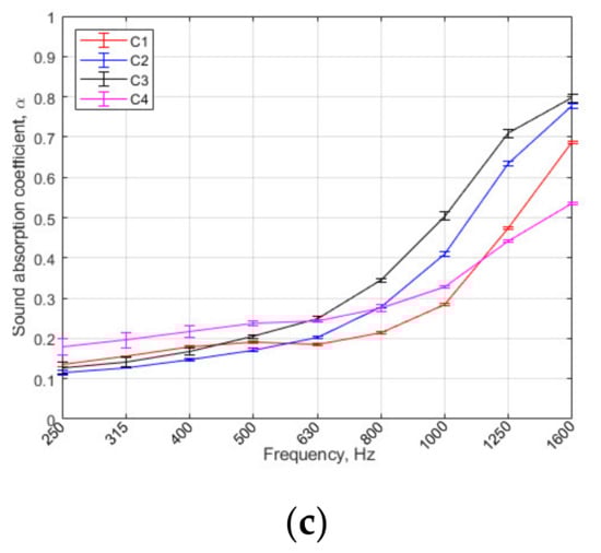 In Figure 4, the sound absorption of different PS and clay composite panels is presented. All the panels are symmetric in vertical direction. The PS and clay composite panels of different grain size showed different behaviour (Figure 4). The PS panels with smaller grain size showed higher sound absorption in low and mid frequencies while others showed higher sound absorption coefficient values in higher frequencies. Such a result could be justified by compactivity of the samples. Smaller grain size samples are more compact and denser, which leads to higher density values and eventually to higher sound absorption values in lower frequencies (250–800 Hz).