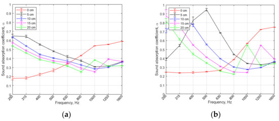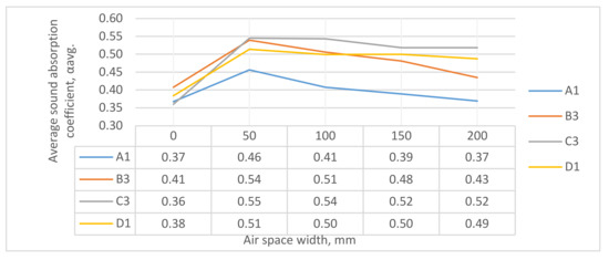 In Figure 5 the sound absorption using different amounts of air space behind the samples is presented. It is shown that using samples A1 and D2, there are no visible wave interferences within the measured frequency range which results in more stable but lower sound absorption coefficient values. Such phenomena are influenced by the sample itself by absorbing waves of certain frequencies and in the result, there is no standing wave to be interfered. However, such phenomena were found only with A1 and D1 samples, which were denser compared to B3 and C3. Using B3 and C3 samples, resonances were clearly seen (see Figure 5b,c). Such peak values are typically seen in ¼ wavelength when the air gap is present in the acoustic system. The frequency of the peak value depends on the thickness of the air gap. The peak sound absorption values shifted to lower frequencies when the air gap thickness increased, and the peak values of 15 and 20 cm of air gap could not be seen using this measurement system. From a room-acoustics engineering point of view, the 500 Hz octave band frequency is one of the most important. Such panels show the potential to be used for applications in reducing reverberation time of the room.