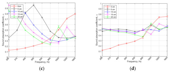 Sound absorption using different air space behind the sample: (a) sample A1, (b) sample B3, (c) sample C3, (d) sample D1.