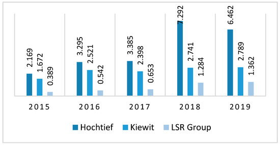 The study was carried out using materials from three construction companies—Hochtief (Essen, Germany), Kiewit (Omaha, NE, USA), and LSR Group (St. Petersburg, Russia)—during 2015–2019. These companies were selected for the study since they occupy a leading position in the construction industry of their country and use the concept of waste management in their activities. The initial data for the study were the financial and corporate reporting of the specified companies for the stated period.