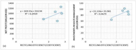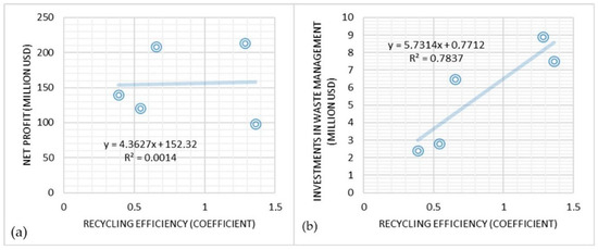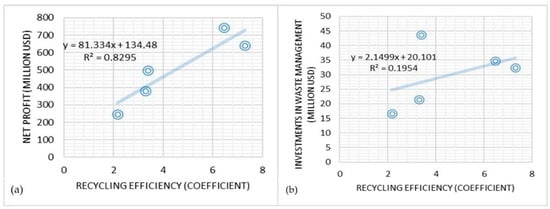 Correlation between: net profit and the level of recycling efficiency in the LSR Group (a); and investment volumes and the level of recycling efficiency in the LSR Group (b). Source: Compiled by the authors.