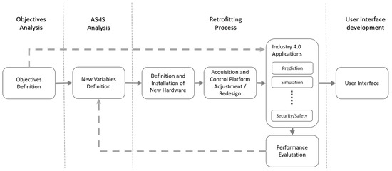 Industry 4.0, also called the fourth industrial revolution, is the natural consequence of the third revolution [1], and it is mostly based on two main factors: Internet of Things and Services (IoT) and Cyber-Physical Systems (CPS) [2]. The implementation of Industry 4.0 aims to guarantee businesses a competitive strategical advantage, organization agility, organizational efficiency and effectiveness, profitability, manufacturing innovation, maintenance costs [3], improved product safety and quality, improved operations, delightful customer experience and environmental and social benefits [4,5]. As a result of its implementation, businesses could achieve a better result in the three dimensions of the Triple Bottom Line (TBL)—economic, social and ecological. Businesses that operate with the aim of achieving these three principles can be defined as sustainable [6,7]. The implementation of Industry 4.0 technologies is not simple and often presents potential problems, particularly for Small and Medium-Sized Enterprises (SME). Such problems can include limited availability of financial resources, limited knowledge and scarce technological competencies [8]. Moreover, even if the use of technologies such as IoT and CPS improve the quality and the safety of the product and the process, another new risk, such as problems connected to cybersecurity, could emerge [9]. SMEs, which make up 90% of European industries [10], are those which encounter greater difficulty in the implementation of Industry 4.0. Nonetheless, they must find a way to adapt to remain competitive against multinational industries [11]. Whereas that the process plants often have a useful life that exceeds 20 years, in many cases, it may be very economically inconvenient to replace the old plant with a new-generation plant designed for Industry 4.0 [12]. Moreover, when a plant is replaced, it must be considered that the replacement includes an extended machine downtime. This is often unsustainable in terms of time. In this respect, it would be useful to evaluate a retrofit operation. Retrofitting improves the accuracy, energy consumption, safety level, maintainability and ease of use of an old plant to obtain optimal plant performance. In the context of Industry 4.0, we talk about smart retrofitting. In addition to the classical retrofitting features, smart retrofitting involves implementing all necessary tools and technology provided by Industry 4.0 [13]. Retrofitting is related to the need for sustainability, productivity and increased technological level. Therefore, with a smart economy and high connectivity, retrofitting allows the introduction of old plants in Industry 4.0.