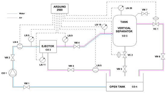 All mechanical sensors, such as the pressure gauges placed near the ejector, have been replaced with analog instruments. The acquisition and control board used in this case is an Arduino Mega 2560, which accepts an input voltage for analog signals from 0 to 5 volts. Most of the sensors installed are equipped with a 0–5 volts output; the sensors with a different output range have been equipped with a converter that has equalized the output voltage to the voltage accepted by the acquisition card. Figure 4 shows the layout of the system with the new equipment installed.