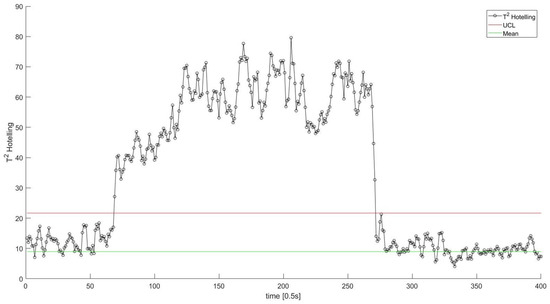 Figure 7 shows an example of data collected where is clearly defined the working condition and the out-of-control condition. Once the anomaly is generated, the system switches from a control condition (T < UCL) to an out-of-control condition (T > UCL).