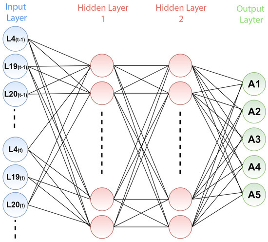 Several studies [40,41,42,43] have shown that when you have available data related to anomalies, or you are able to simulate anomalies (as in this case), anomaly detection algorithms, based on neural networks, have obtained good results. For that, the second problem was dealing with an MLP neural network (see Figure 8). The dataset described above was divided into a training dataset and a test dataset; subsequently, systematic experimentation was carried out to evaluate the best configuration for the neural network.Table 7 shows the parameters and ranges used for systematic experimentation.