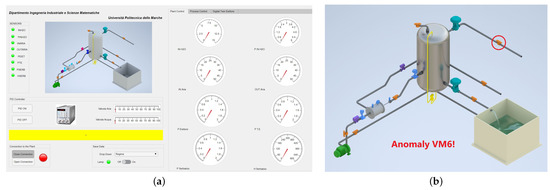 With the user interface it is possible to monitor the process through the visualization of the sensor state by gauge indicators and graphs, the evaluation of the real behavior compared to the digital model, and the visualization of eventual anomalies directly on the plant 3D digital model. (a) User Interface; (b) example anomaly on VM6.