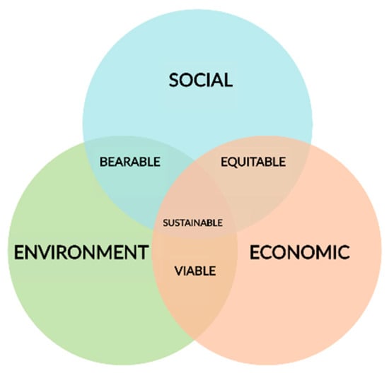 Current urban centers clearly follow an unsustainable model to a greater or lesser extent. Therefore, numerous authors have studied the impact of these centers on the environment, examining new models that mitigate the damage as much as possible. Saaty and De Paola, in their article entitled “Rethinking Design and Urban Planning for Cities of the Future,” published in 2017 by Buildings [], sought to determine the best model for cities of the future. After analyzing the advantages and disadvantages of several types, these authors concluded that, regarding urban planning and design, a compact circular city is the optimal model, taking into account factors such as urban expansion, the transformation of the buildings, and environmental impact. Furthermore, the strength of this model is the equidistance between various points as well as the optimal distribution for public transport []. On the other hand, for greater sustainability, their design layered different zonings, designating the central space as residential (with gardens on roofs and walls) and the outermost as industrial zones, thereby reducing the pollution within the city []. This model could direct the current path toward sustainability, transforming cities into sustainable systems, which could be defined as any human urban center (city, metropolis, megalopolis, etc.,) interacting with or in equilibrium with sustainable development []. In this sense, the Brundtland Report, on defining sustainable development (as mentioned above) as meeting the needs of the present without compromising the ability of future generations to meet their own needs [], establishes a three-dimensional concept that encompasses economic, social, and environmental issues, which are interrelated []. We call these the three pillars of sustainable development (Figure 2).