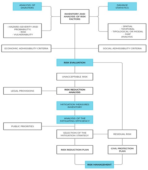 Analysis and management of natural hazards. Boxes in blue represent the steps in which the tool used has proved valid (own design based on []).