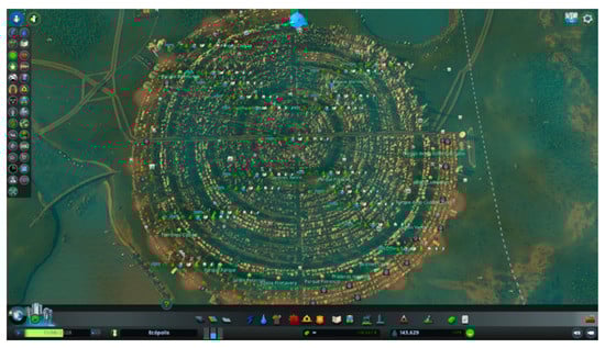 Consulting the literature, we confirmed that the model of the city that was designed at first was not suitable. As shown in Figure 6, this city did not have a definite shape, although an intent was made to transform it into a compact circular model that was finally constructed in another game, as also shown in Figure 6. Despite having to generate a new game, with the first city, we determined the best location for the different zonings, which coincided with the literature consulted. Therefore, in the new city, the industrial zones were situated on the exterior of the city in order to keep the pollution as far as possible from the inhabitants. The residential zones were located in the center, and between the two areas appeared the commercial zones, offices, and more residential areas, separated by greenbelts. With these separations, which acted as leisure areas, we managed to keep noise as low as possible in residential zones.
