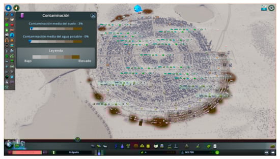 With respect to environmental sustainability, from the outset the design was meant to be as environmentally friendly as possible. For this, we used renewable energies, carried out urban planning based on the literature regarding sustainability in cities, and we established the most efficient water-purification systems, among other measures. The results imply that this goal was achieved. For example, the mean soil pollution was 3%, concentrated in the industrial zones without reaching the residential zones. Regarding water pollution, the game offered only two purification systems (which we called “water purification” and “ecological water purification”), which did not offer purification efficiency and therefore this could be improved by adding different types of purification stations for waste waters including their purification efficiency. With respect to traffic, the compact city model proved optimal for this goal, providing shorter distances between points, which, together with the zoning chosen, enabled emergency services to reach their destination more rapidly after a catastrophe. In this sense, we considered a possible extension in this work in which the same hazards were simulated in a city with a distribution different from that selected in order to determine the losses sustained and the efficiency of the emergency services rendered. This could mean a modification of the present formula for calculating risk, based on vulnerability, hazard and risk elements, and the importance of the distribution of these elements could be added. In relation to sustainability, we conclude that the game had highly simplified mechanics with respect to the construction of cities as well as their sustainability. For example, in terms of water quality, we provided data on availability and the percentage of water pollution, but it did not tell us the effectiveness of the waste-water treatment stations nor the parameters to take into account. Similarly, in relation to the waste management and city energy, the game offered only certain data, such as the capacity of the disposal sites or energy availability. Therefore, we could not delve into these aspects in relation to city sustainability.
