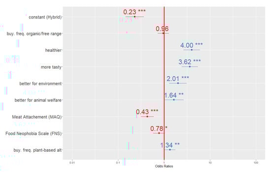 It is to highlight that the constant for the meatyhbrid revealed a negative and significant value (−1.470 ). That is, the analysed sample has a much higher preference for the reference category meat in comparison to the meathybrid alternative and to the “neither/nor”-option. This outcome was expected due to the chosen sample of meat eaters. The MAQ-results demonstrate that, the more meat attached the interviewees, the higher the probability not to choose the hybrid option (−0.837 ) (see Table 8). This finding is in line with Graca et al. [], who found significant negative associations from meat attachment to meat substitution.