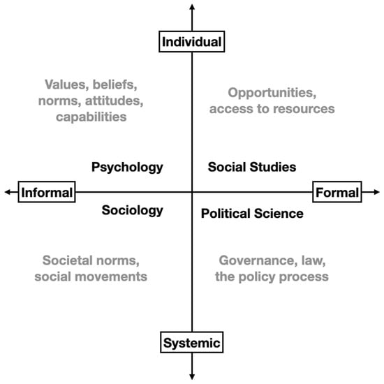 Combining elements of scale (a) and organisation type (c), Rao et al. [35] developed a 2 × 2 framework of social and political change processes in which scale varies from individual to systemic (y-axis) and institutions/organisations vary from informal to formal (x-axis). This typology (Figure 1) is helpful in illustrating the need for more integrated, cross-disciplinary thinking about how change happens [7,32].