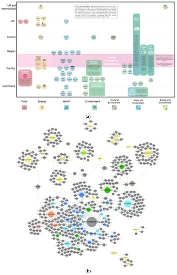 Barbrook-Johnson [19] developed several methods for mapping public–private partnerships in the UK food–energy–water–environment nexus. One infographic (Figure 4a) differentiates between individual and “umbrella” (multiple) partnerships and situates them on x/y axes according to their environmental domain (x axis) and geographical scale (y axis).