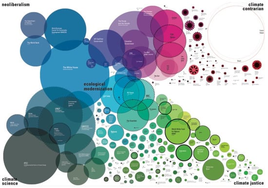 One attempt to visualise discourses and influence was Boehnert’s [27] rich illustration of UK, American, and Canadian actors in climate change communications (Figure 5). Actors were presented as individual circles and positioned and coloured in relation to five policy discourses: climate science, climate justice, ecological modernisation, neoliberalism, and climate contrarianism. The diameter of each actor’s circle was sized according to “relative influence”, which was determined by various combinations of metrics (e.g., population, revenue, Alexa ranking, twitter following, membership, and readership) depending on the type of actor (e.g., government, media organisation, corporation, and think tank). Since there is no objective measure of “influence” or a unifying unit of measurement across organisational types, Boehnert [27] relied on a degree of subjective value judgement based on experience.