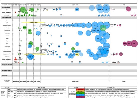 The clearest observation in the map of non-state actors (Figure 8) is the strength of the group of actors aligning with the UK government’s official 2050 net-zero target in terms of number of organisations, breadth of cross-sectoral support, collective influence, coherence of policy discourse in favour of “growth” (blue)—an economic growth and jobs-led transition to a low-carbon economy. This is a technocentric, “eco-modernisation” approach [21,85] which views GDP growth as necessary for, or at least compatible with, the country’s global climate responsibilities. A detailed plan has yet to be put forward by the government explaining how a UK transition to net-zero carbon by 2050—which would require a whole-systems approach, cross-sectoral coordination, and wide public support—can be achieved at all, let alone achieved within sustainable limits and without relying on untried or hypothetical carbon removal technologies.