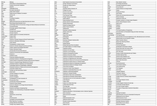 Political and policy actors in the UK transition to a low-carbon economy are influenced by a range of other actors, institutions, and events at the international scale [47] as well as by the policies and other initiatives of devolved nations, regions, cities, and local government [48]. Our typology and actor-mapping method may be applicable for all scales. However, the sample organigram and map presented in the results section largely capture the national scale, with an overview of international and subnational actors. Individual companies are not included in this map but are instead represented by the relevant networks, institutes, and alliances. Both the typology and maps include actors actively engaged in the politics and policy advocacy of greenhouse gas (GHG) mitigation rather than all stakeholders (i.e., everyone impacted by policy); they do not include those engaged in climate-related adaptation. Also omitted are organisations whose primary purpose is to provide funds to support climate-related projects.