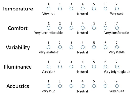 The occupant survey questions (available in Supplementary Materials) were developed based on the Building Use Studies (BUS) reporting format [62]. The study was conducted according to the guidelines of Economic and Social Research Council (2012) Framework for Research Ethics and approved by the Institutional Research Ethics Panel of the University of Nottingham Ningbo China (24 April 2018). The data collection was performed in the second half of May at the end of the second academic semester to ensure that all participants had been using the building for longer than 6 months as suggested by the BUS method. Paper questionnaires were distributed by hand personally to all the occupants present in the building as suggested by Gou et al. [29] for higher answering rates. Around 65% of occupants (48 subjects in total) agreed to participate in the study and all of them gave their informed consent for inclusion prior to participation. The majority of the building’s users were located in the teaching areas of Zone 1 and Zone 2 (Figure 1b). The first set of questions enquired about participants’ personal details such as: gender, age, time spent in the building, and which floor they usually use. Several studies [18,63,64,65,66] state that females tend to report lower satisfaction with IEQ than males since they tend to be more sensitive to temperature changes. Other studies [58,67,68,69,70] report that men prefer lower temperatures compared to women. Breslin [71] and Webb and Parsons [72] specify that the gender difference in satisfaction was primarily observed in colder conditions while neutral or slightly warmer than neutral the thermal perception of these target groups was similar. Therefore, one of the objectives of this research was to determine if the gender influence on the IEQ satisfaction level can be observed in analyzed data. Furthermore, according to Fanger’s thermal comfort formula, the participants’ metabolism rate, which is dependent on age, is one of the influencing factors affecting the occupants thermal comfort perception [58]. Thus, the collected data coming mainly from university students might be only representative for the young adult age group. In the second set of questions, building users were required to rate in general summer temperature, its comfortableness, and variability, as well as indoor illuminance and acoustics using a 7-point Likert scale as shown in Figure 3. For all the variables, number 4 represented the neutral reply, while all other numbers represented different categories of the variable (e.g., 1 = very uncomfortable, 2 = uncomfortable, 3 = slightly uncomfortable, 5 = slightly comfortable, 6 = comfortable, 7 = very comfortable). Thus, for each variable except for temperature, the highest rating represents the most satisfaction. It should be noted that the occupants could neither adjust the thermal environment nor the illuminance to their specific preferences, but they could freely relocate to a more comfortable (in their view) place in the room. The third set of questions indirectly evaluated indoor air quality parameters such as CO2, humidity, particulate matter, formaldehyde, and other chemicals that cannot be detected by humans, through a question “Do you experience any of these symptoms after spending more than two hours in the building?” The respondents needed to mark every suitable option: fatigue and drowsiness, nausea and dizziness, eyes irritation, sore throat, nose discomfort, headache; there was also a “None” option. The two-hour threshold for the question was decided based on the longest classes time period, after which the occupants can mobilize and leave the building. These parameters were adopted from SBS phenomena.