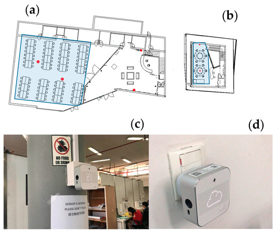 Teaching areas represented by blue polygons and the location of sensors represented by red dots (a) on Zone 1 plan view in Revit; (b) in Zone 2 plan view in Revit; (c) in Zone 1 at the middle of the teaching area; (d) in Zone 2 near the wall.
