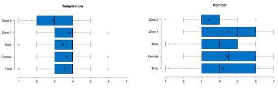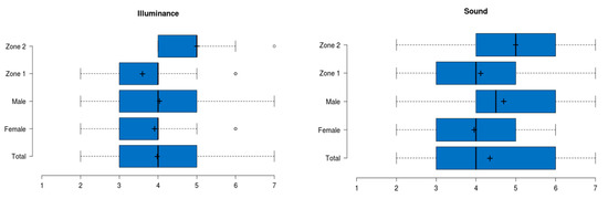 Comparing female and male responses, no statistically significant difference between these target groups was found on any of the evaluated parameters. Both of the groups reported being slightly hot but within a comfortable extent, and both of the groups were on average satisfied with illuminance and acoustic environment.