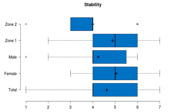 Dividing the total amount of answers into location target groups (Zone 1 and Zone 2) revealed significantly greater satisfaction with thermal conditions in Zone 1. Thus, in that zone, 55% of occupants reported a satisfactory comfort mark, while in Zone 2, 69% of users stated the temperature was higher than the neutral level. However, light levels were perceived to be better in Zone 2: illuminance in Zone 2 was given a score of 5.00, while in Zone 1 it was 3.60, with the p-value being equal to 0.0002. The acoustic environment in Zone 2 was evaluated slightly higher as well, but these results had little statistical significance (p value equal to 0.0541).
